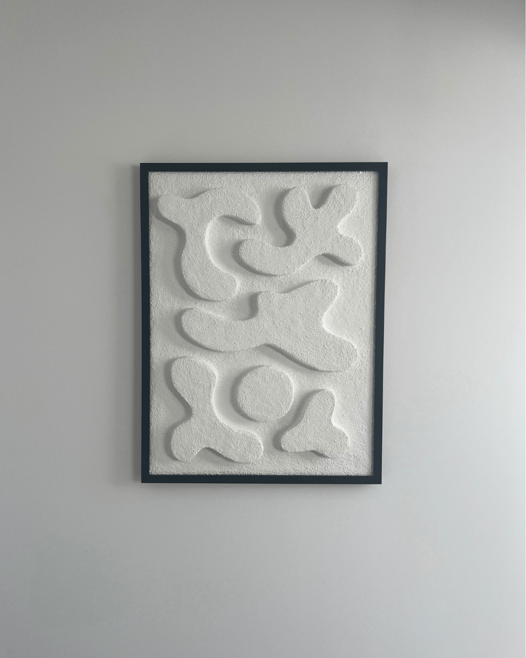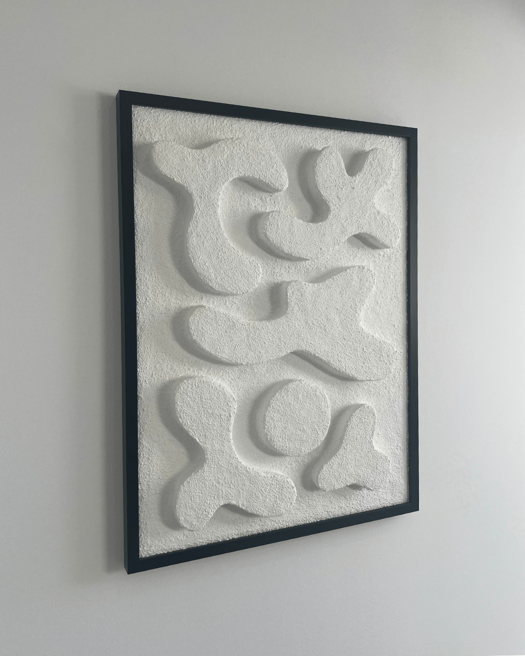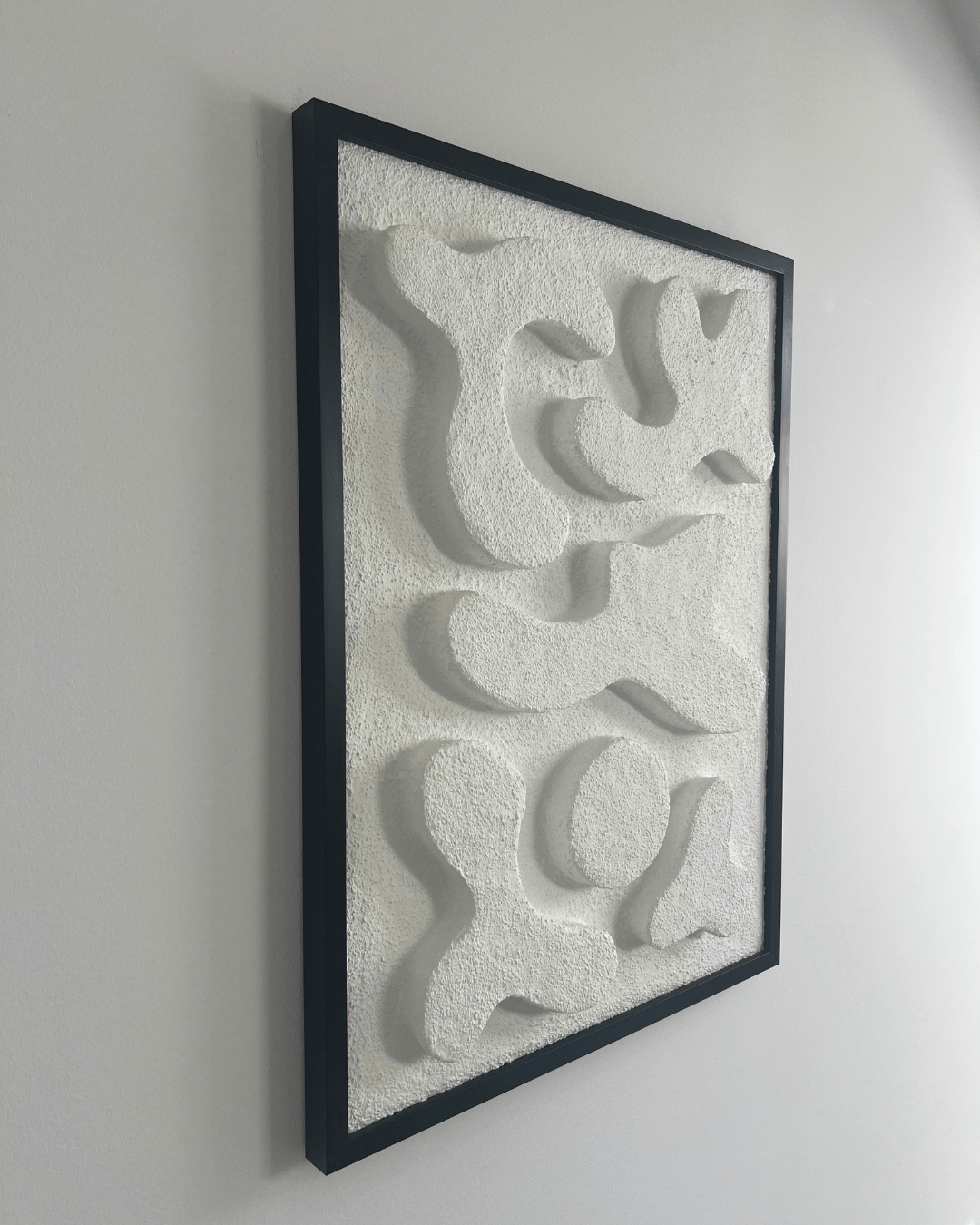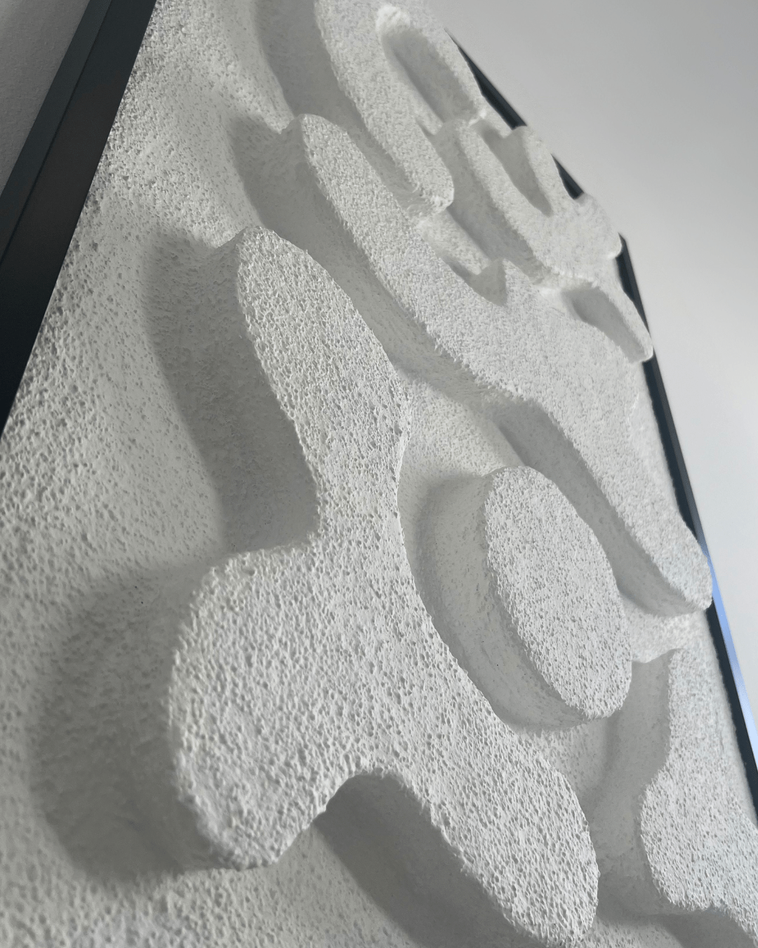 | MATERIAŁY | czarna drewniana rama, włoskie płótno bawełniane, krosno sosnowe, autorska mieszanka gipsów |